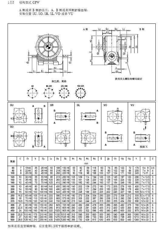 CFW蝸輪蝸桿減速機廣泛應(yīng)用于礦山、建筑、石油、冶金等重型行業(yè),其傳動扭矩大、傳動效率高、使用壽命長等特點在國內(nèi)得到大力推廣,CFW減速機為環(huán)面蝸桿傳動系列,制造工藝相對復(fù)雜所以價格較高。 CFW蝸桿減速機采用輸出軸并配有輸出法蘭連接,隨意安裝。用戶選擇時可根據(jù)實際使用需要選擇合適的安裝方式,具體安裝形式及安裝尺寸如下圖所示