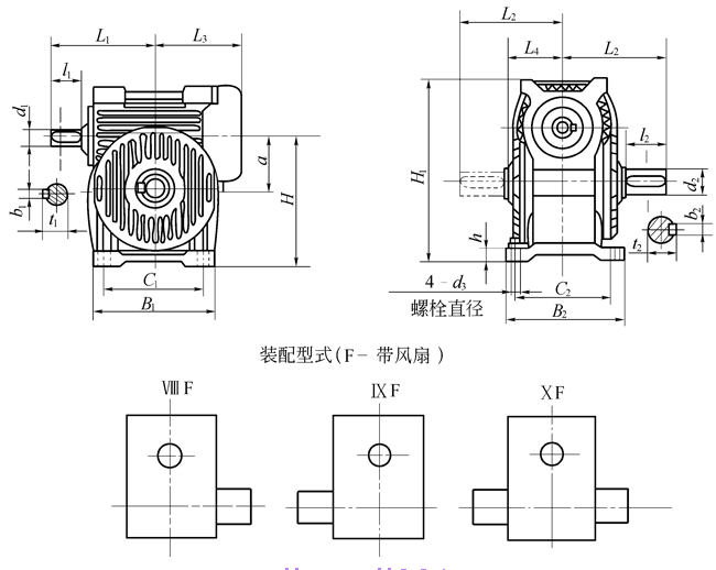 KWO蝸輪蝸桿減速機(jī)的外形、安裝尺寸和裝配型式 (mm)