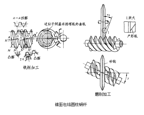 錐面包絡圓柱蝸桿螺旋面由錐面盤形銑刀或砂輪包絡而成,蝸桿軸線與刀具軸線在空間交叉成分度圓柱上的導程角。形成的齒廓在不同截面上成不同的曲線。齒廓形狀不但與蝸桿幾何參數有關,而且與刀盤直徑有關。
